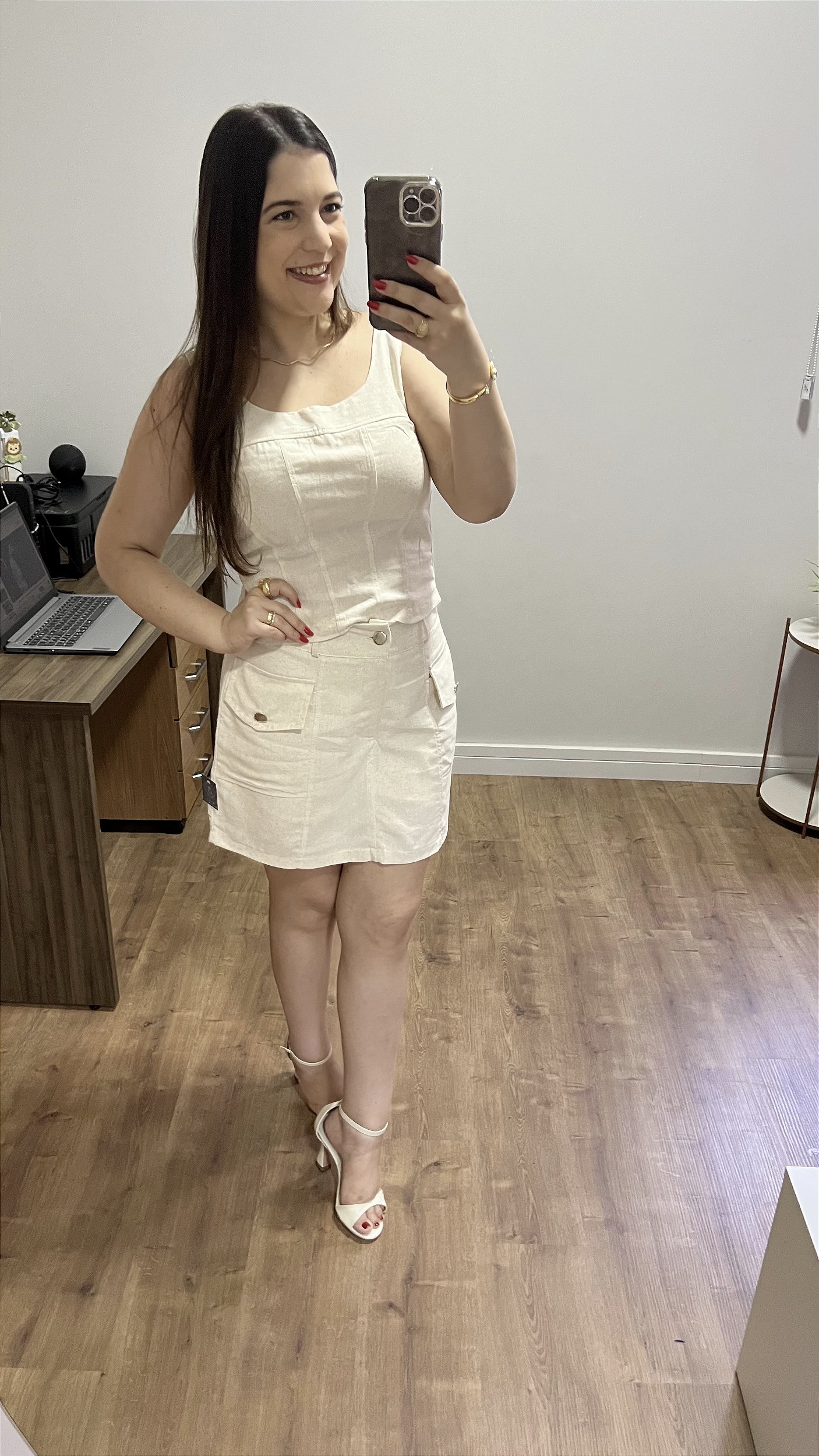 Conjunto duas peças composto por short saia sendo saia atrás e zíper frontal com botão em tecido linho e a blusa não possui bojo, alça larga e recorte reto com lastex nas costas.