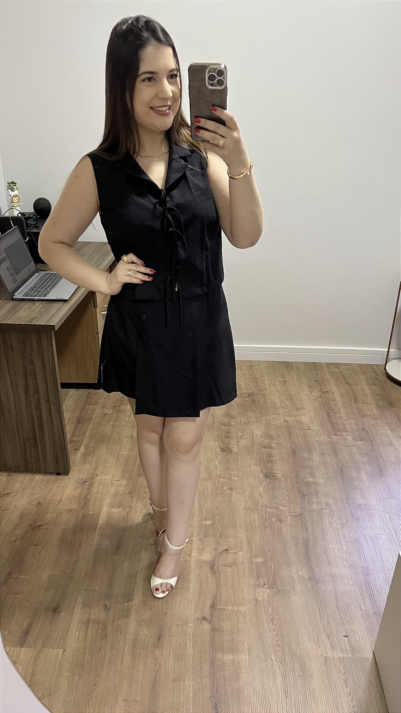Conjunto duas peças composto por short saia sendo short atrás e super lateral e a blusa regata possui gola e amarração frontal, tem forro não fica pele à mostra.