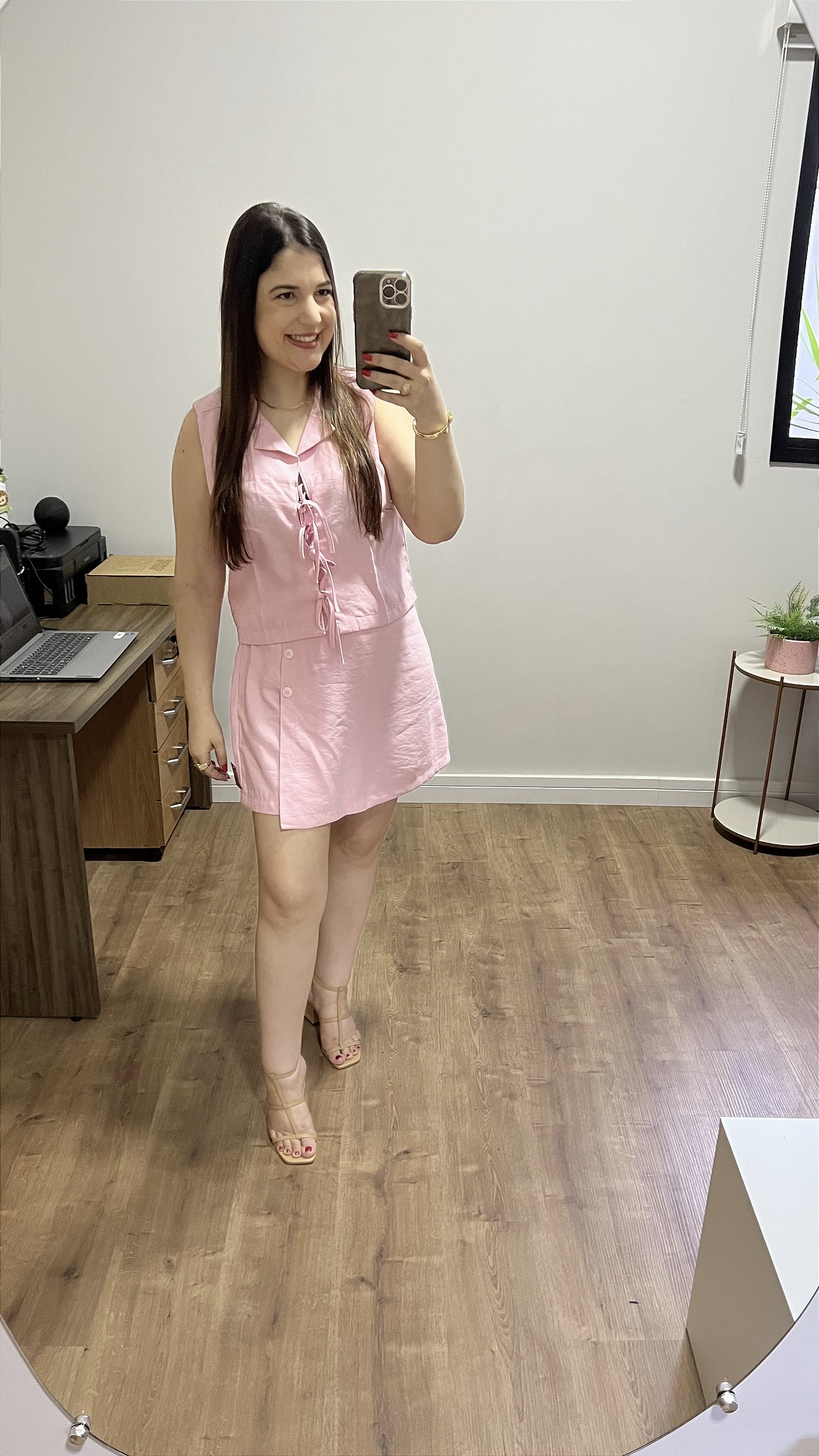 Conjunto duas peças composto por short saia sendo short atrás e super lateral e a blusa regata possui gola e amarração frontal, tem forro não fica pele à mostra.