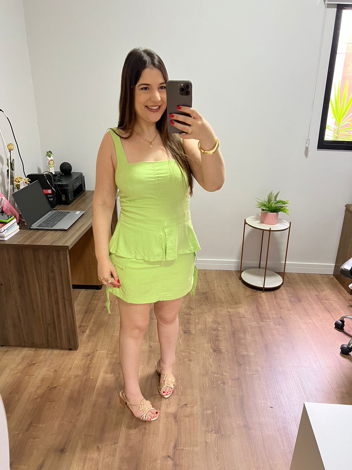 Conjunto duas peças composto por short saia sendo saia a parte de trás, em tecido linho com forro de short, e zíper frontal. A blusa possui bojo e zíper nas costas, alças com regulagem detalhe de abertura nas costas que promove caimento na peça em sua vestimenta.