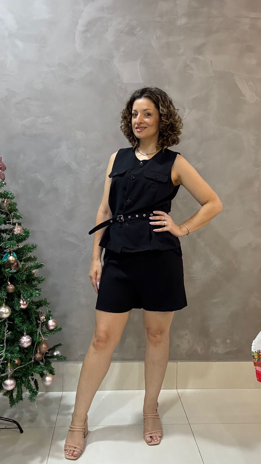 Conjunto duas peças composto por short alfaiataria com ziper e botão frontal, proposta mais solta e não justa nas pernas, promovendo um caimento social e elegante. Max colete em alfaiataria, recorte reto com abertura em botões e detalhe de cinto no mesmo tecido e cor.
