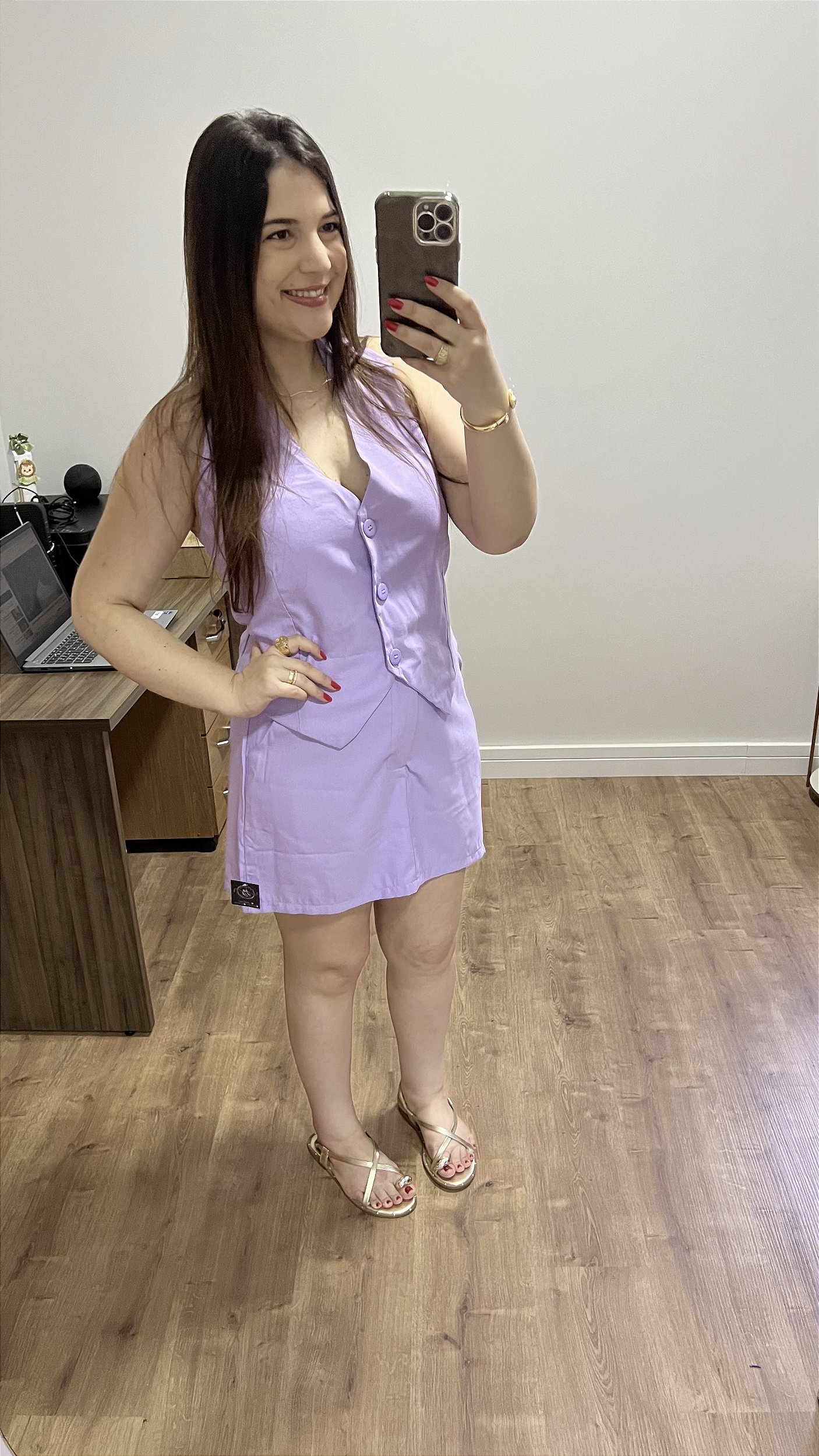 Conjunto duas peças composto por short saia sendo saia atrás e zíper frontal com bolsos lateral e blusa frente única, fechamento em botões e lastex nas costas