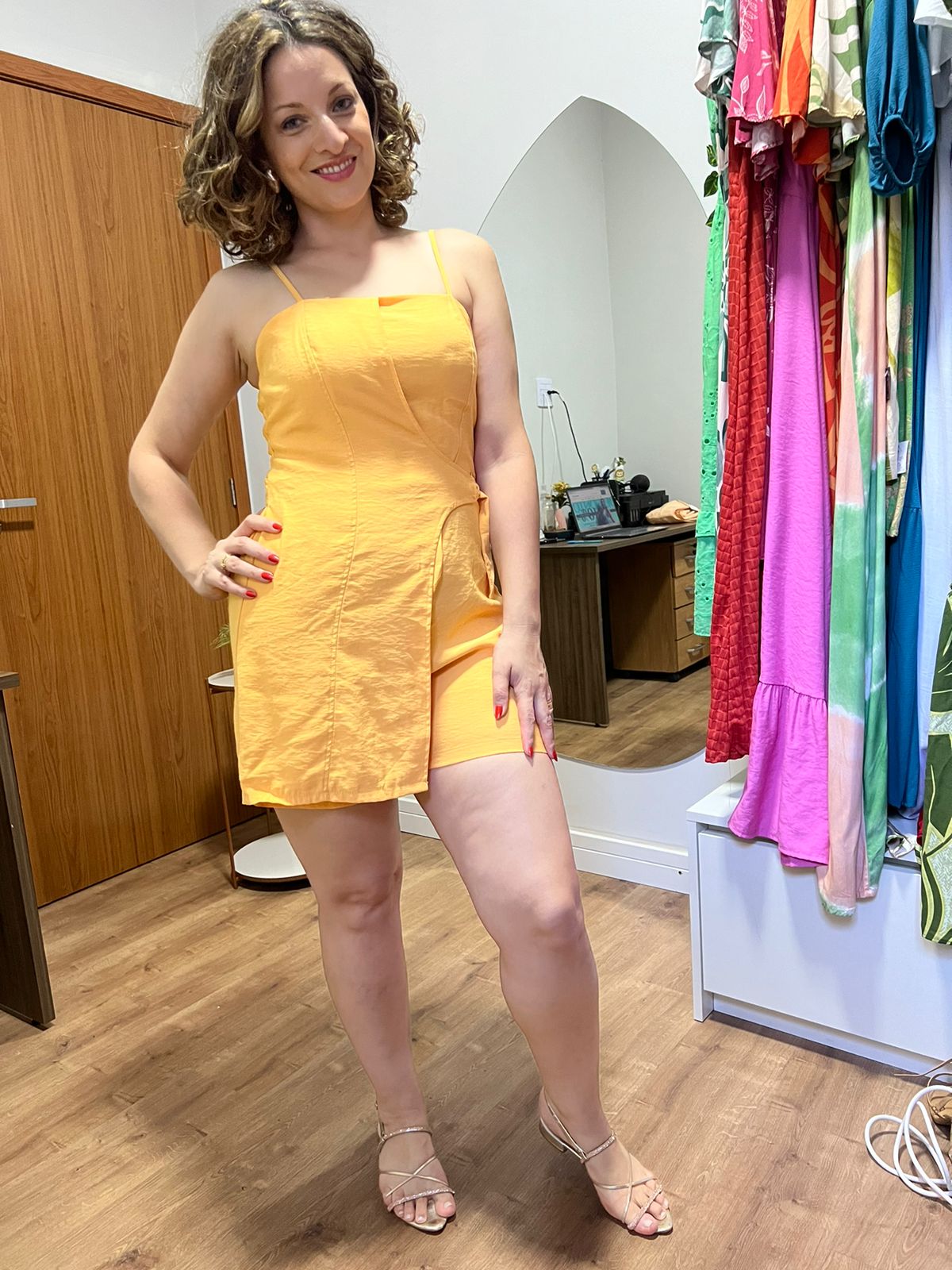 Macaquinho em tecido tricoline (mais encorpado que o viscolinho), não tem forro, possui bojo, alça regulavel e lastex nas costas.
