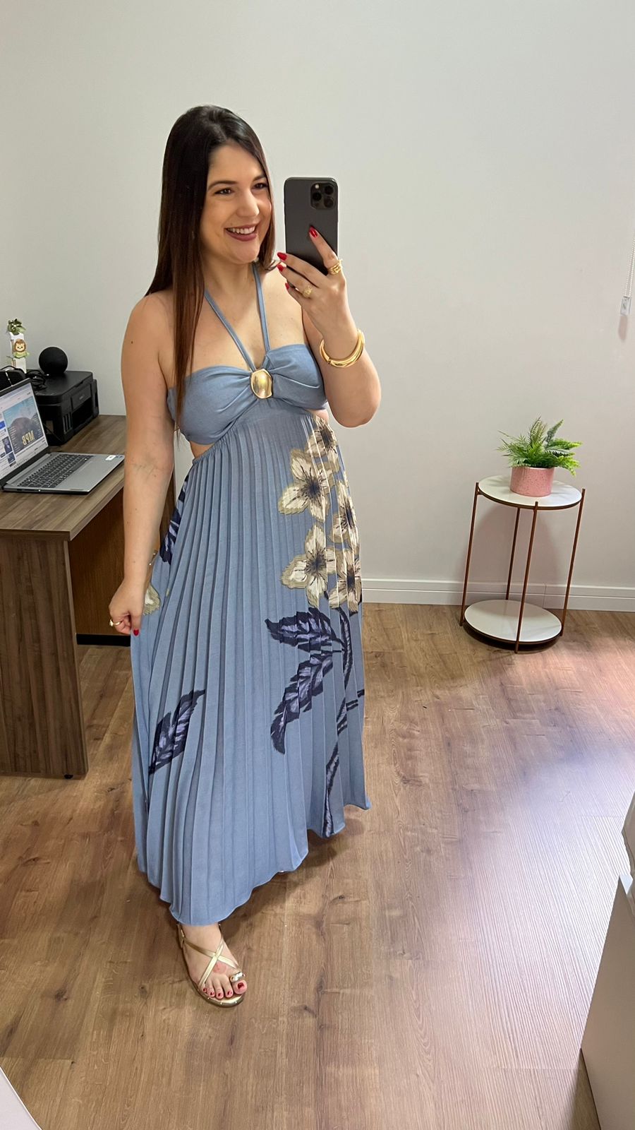 Vestido longuete em tecido poliester, não precisa de forro pois o tecido é encorpado e não fica transparente e não marca o corpo, comprimento é proposta solta plissado, não possui bojo, detalhe no busto dourado, amarração frente unica, lastex nas costas e na cintura.
