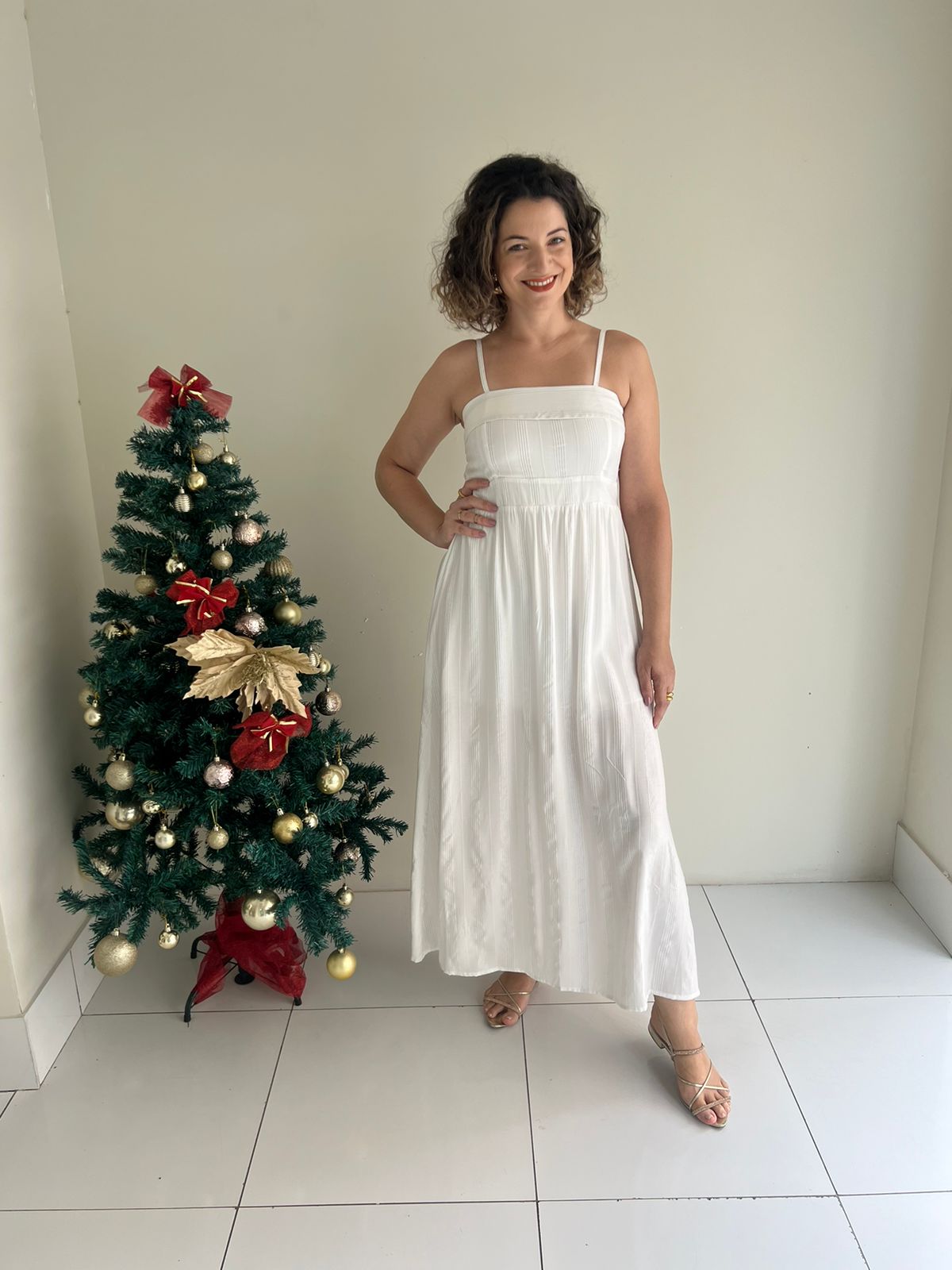Vestido midi em tecido tricoline forrado, o tecido possui fios prata, não possui bojo, alça regulavel, lastex nas costas, recorte reto comprimento e busto.